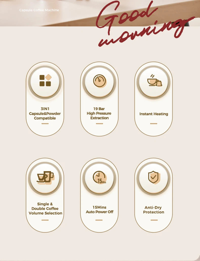 โ ใ3 In 1 Compatible DesignใCafelffe capsule coffee machine is compatible with Nes* original capsuleใDolce Gusto* capsule and coffee powder. Can satisfy a variety of coffee needs, not need to purchase different machine.